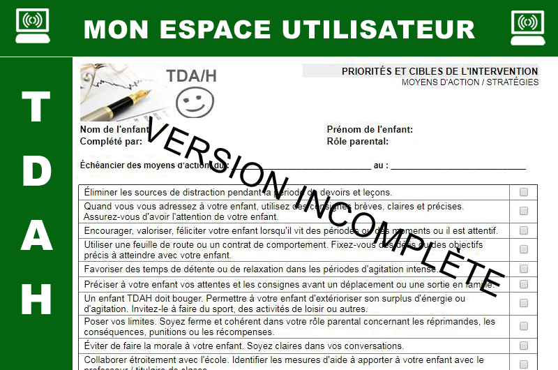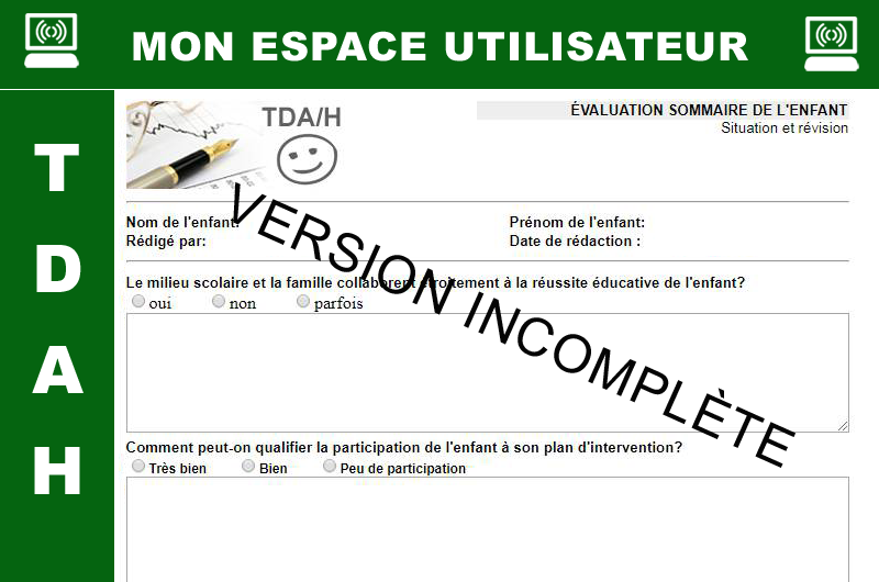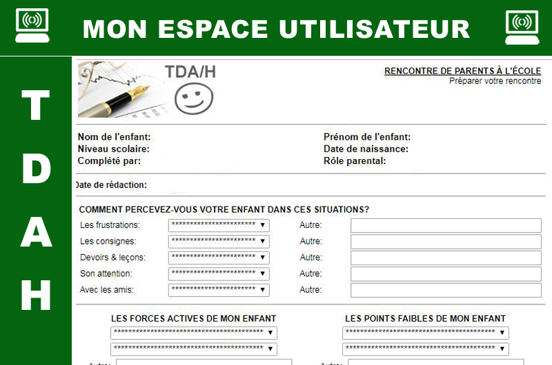 Nous devons comme parents, comme agent scolaire prendre des approches différenciées pour favoriser la réussite scolaire d'un enfant ou d'un élève avec un TDAH. Nous avons développé sur tdahapp.com un questionnaire sur le TDAH qui offre une analyse instantanée avec des résultats valables à un plan de traitement. La compilation des données recueillies porte sur des composantes comportementales de l'environnement socio-éducatif. Hautement novateur et développé par une équipe de professionnels en intervention de première ligne en milieu scolaire, ce questionnaire sur le TDAH s'inscrit dans une perspective synergique visant à stimuler l'utilisation de la technologie éducative afin de faciliter la recherche de solutions et de moyens d'intervention auprès des élèves, des enfants présentant un trouble déficitaire de l’attention. Vous êtes parents et vous désirez être plus outillé et informé sur le trouble déficitaire de l’attention avec ou sans hyperactivité, le questionnaire sur le TDAH sur tdahapp.com s’adresse à vous. Pour un enfant, un adolescent la facilité à se concentrer et une attention soutenue en classe demeurent des incontournables à la réussite éducative. Ce questionnaire sur le TDAH permet de vérifier et de valider la constance de diverses structures du comportement de l'enfant, adolescent présentant un trouble déficitaire de l'attention avec ou sans hyperactivité. Utilisé périodiquement, cet outil clinique d'évaluation et de dépistage ne doit pas être un simple exercice de catégorisation pour établir un diagnostic. Par des observations directes, une analyse des résultats et des hypothèses soulevées par l'évaluation, les parents pourront orienter efficacement le plan de traitement de leur enfant présentant un TDAH. Le questionnaire d’évaluation de la version du parent contient 58 questions. Simple à compléter l'analyse des résultats se fait instantanément par un seul clic. La compilation des données recueillies porte sur des composantes sur le trouble déficitaire de l’attention avec ou sans hyperactivité et des composantes comportementales. Le dépistage précoce du TDAH chez l’enfant ou l’adolescent est essentiel dans l’élaboration et l’orientation d’un plan de traitement qui suggère des stratégies préventives. Le questionnaire sur le TDAH a été conçu et destiné à des fins variées : A) Recueillir des données qui permettront de faire un premier dépistage afin d'orienter le plan de traitement de l’enfant, l’adolescent. B) Pour dresser un profil comportemental favorable avec des stratégies d’intervention préventives spécifiquement liées au TDAH. Le questionnaire sur le TDAH version parent demeure un outil complémentaire à d’autres mesures et ainsi assurer une analyse complète dans diverses composantes comportementales reliées aux symptômes sur le TDAH. L’analyse des résultats doit conduire à des interventions réalistes, adaptées et répondant aux besoins de votre enfant ou de votre adolescent. |